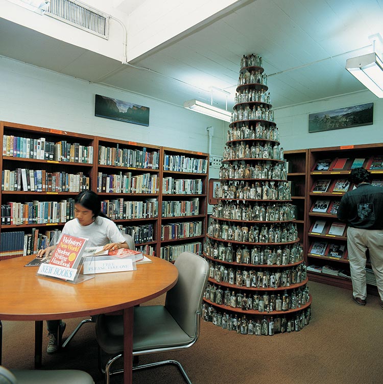First exhibited at Chiang Mai’s AUA Library for the 2nd Chiang Mai Social Installation, multi-tiered library shelves had a plethora of old recycled medicine bottles stacked upon them in the shape of a pagoda. Inside each bottle was a black and white photo of different elderly people taken in their villages on the outskirts of Chiang Mai. A message in a bottle, these folk are marginal people left on the fringes, old and absent. With the title pertaining to the silence of the library but also to communities that are without voice, this site-specific piece was placed in the library to critique that they will be soon forgotten and become history, but also affirm their memory and reiterate that these citizens are worthy of being archived. This work was included in Traditions/Tensions, a large touring exhibition hosted by New York’s Asia Society featuring Asian contemporary artists from four Asian countries.
