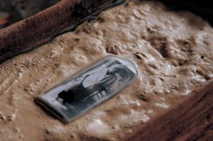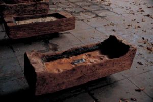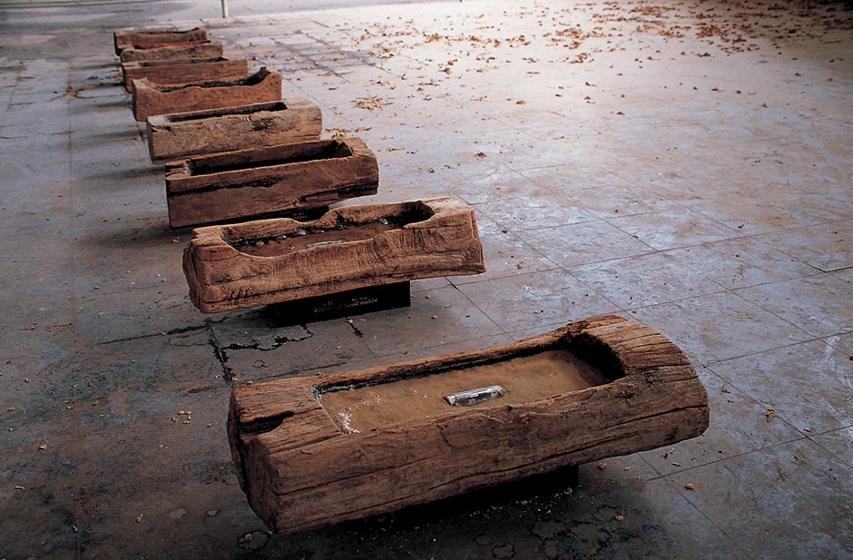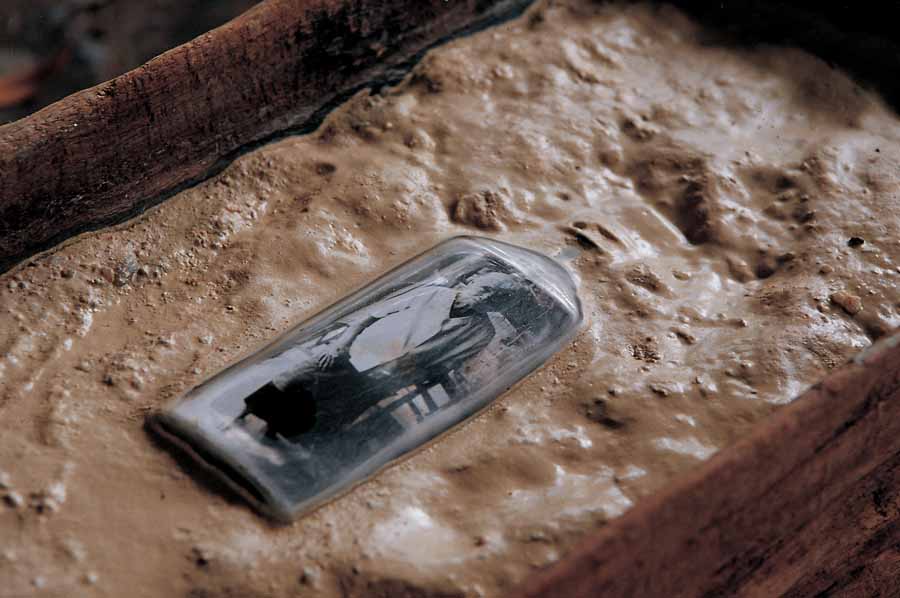 This first work produced in the bottle series, while shooting photographs in a suburb of Chiang Mai, Navin salvaged old glass medicine bottles from a recycling place, placing a black and white photo of different elderly people in their villages inside ten of the soiled receptacles. The closed bottles were placed in wooden pig feeding troughs filled with soil from the differing communities that the elderly subjects hail from. Suggesting these senior citizens have been buried in their home village, the artist incorporated the pig troughs to symbolise that the villagers have become like cattle, herded up and kept alive but not much more. Underneath each trough was a blank book with the name, year of birth and location of each of the villagers.