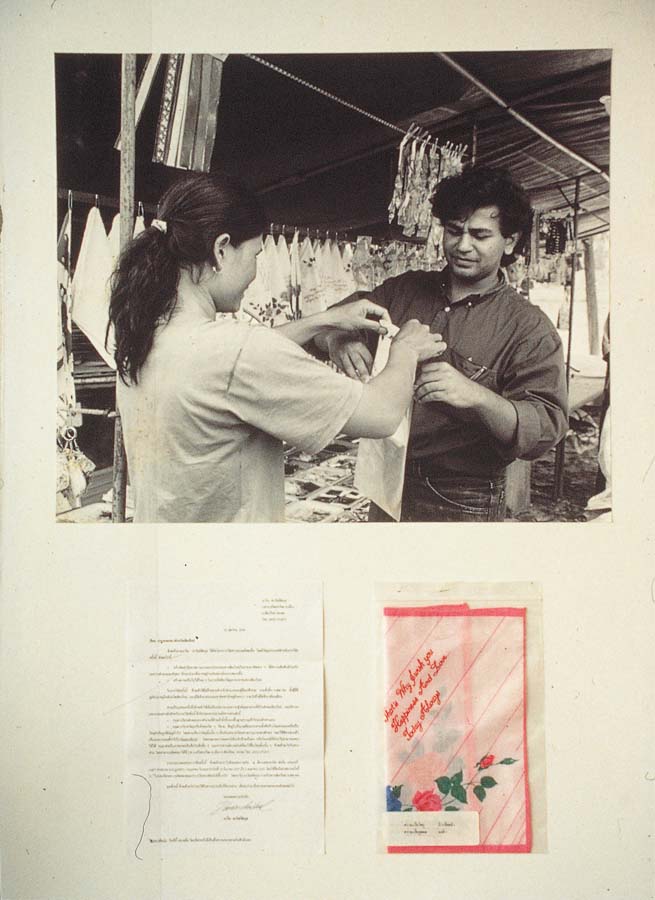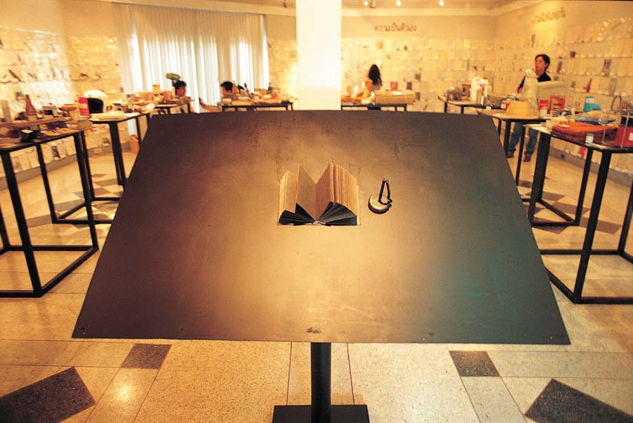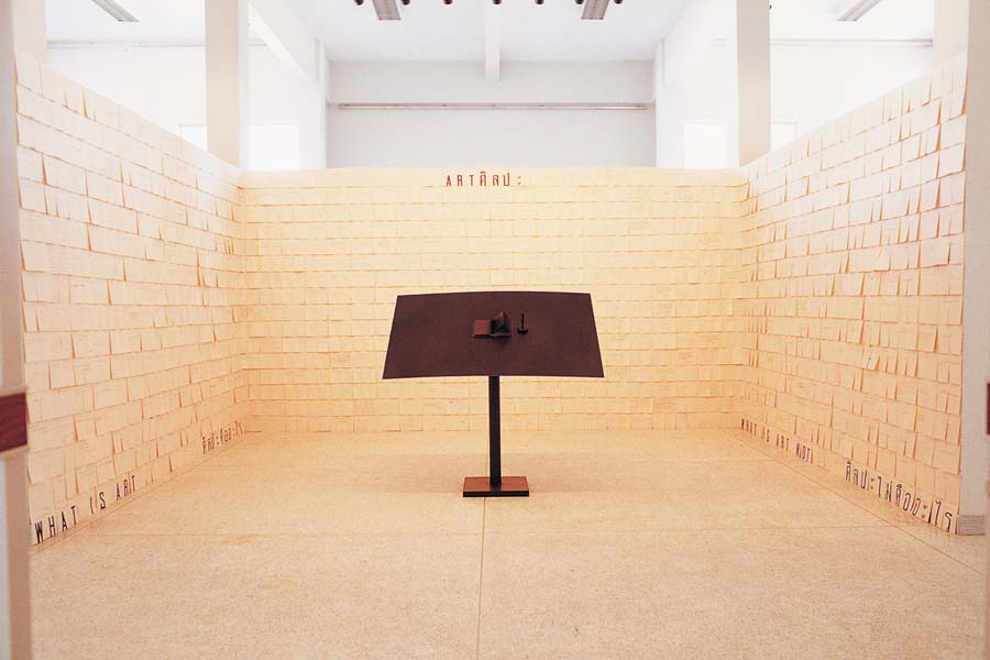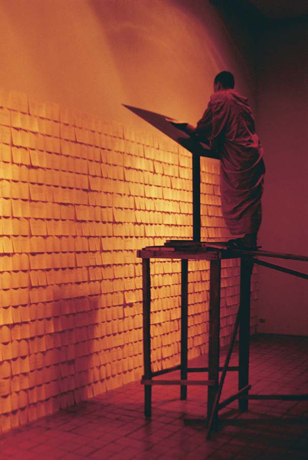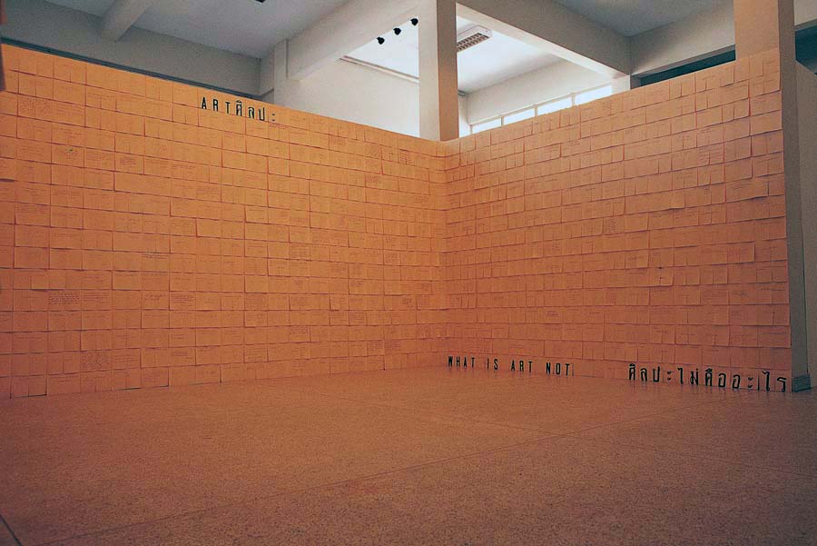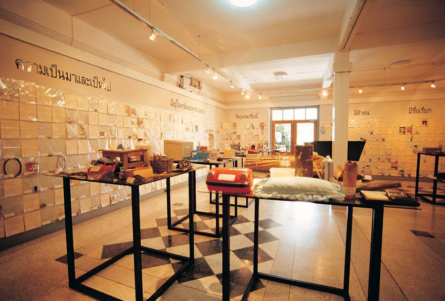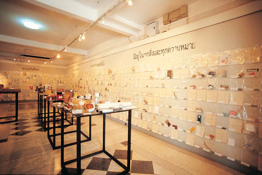 In this two-part series that began in 1992 with the interactive piece Please Donate Your Ideas for A Dispirited Artist, Navin went around his hometown of Chiang Mai asking the public two questions, “what is art?” and “what isn’t art” Using small memo papers to record their responses, the gallery walls were coated with written paper samples while extra paper was available for visitors to continue donating more ideas for the piece. For the second part of the project, the title altered slightly to Please Donate Your Ideas for Dispirit Artistic Research,with the general public asked to give or send the artist what they considered art objects of beauty, which were sealed in clear plastic bags with written details of origin. With 3000 objects donated, the installation displayed a diverse selection of objects pinned to the walls and on tables around the gallery, attributing the series as a collaboration with 3,000 people.