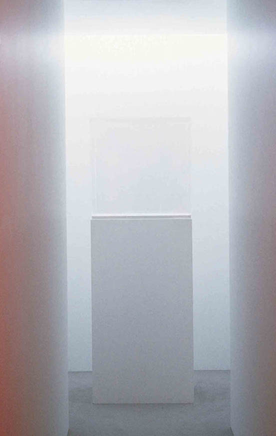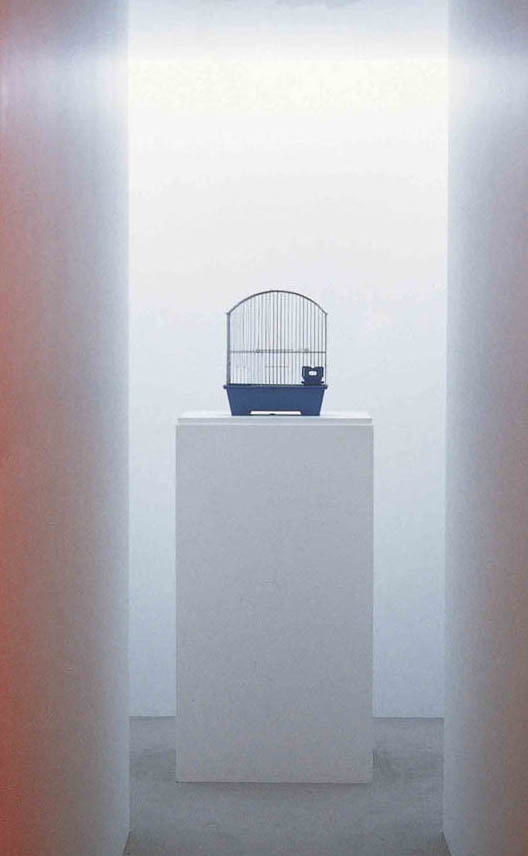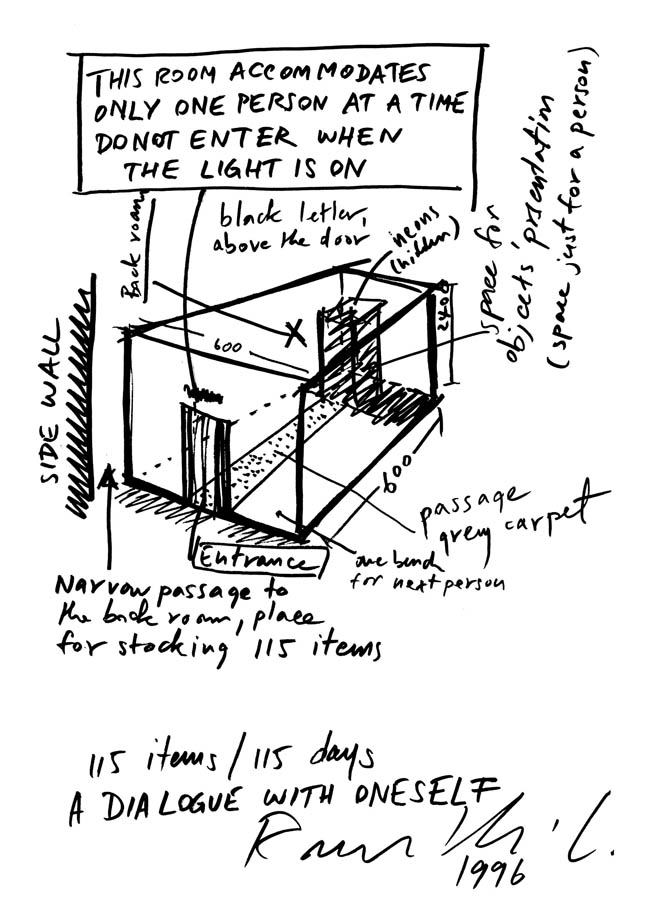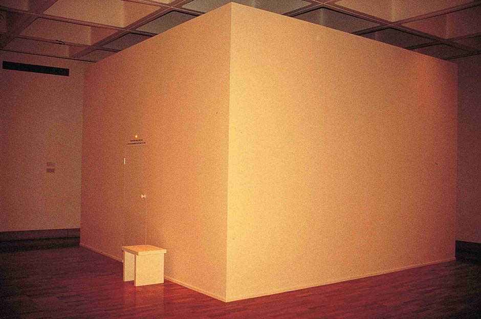 Playing with semiotics, language and how we intuitively perceive things in life, the piece was a small gallery within a gallery, inside which a different object was placed daily for each of the exhibition’s 119 day period. The selection of 119 items by exhibition organizers followed the artist’s predetermined list of objects, universally identifiable ready made household objects, such as envelope, a hammer, a football, a key, a bicycle etc., giving them specific instructions on how to display each item. Subverting notions of art viewing, outside the small white cube room a red light sensor indicated if the room was occupied, with only one person allowed to enter at a time. Aligned to Buddhist precepts, this work wanted the individual to confront the object alone.