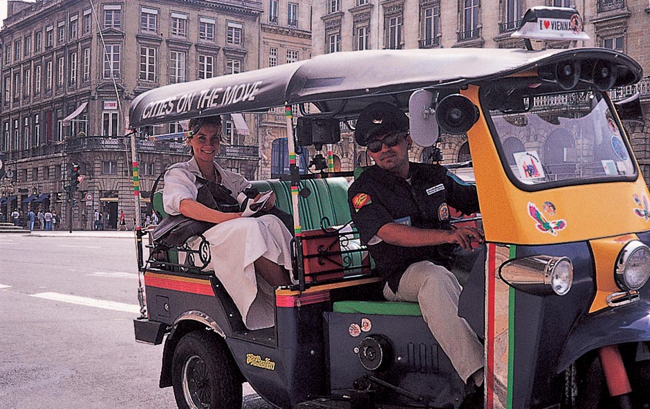 A set of five hand-painted posters for the first Cities on the Move was realised in collaboration with Museum in Progress, a Vienna-based initiative working with international artists to present artworks in media space. Cities on the Move was adopted to title this fake movie along with the Thai name read as Muang Mee Kha, meaning “A City with Legs”. More than 100 large billboards in Vienna were pasted with the Cities on the Move poster series while a national paper provided free pages over the period of exhibition. The two tuk-tuks were greeted by racer Niki Lauda, who tried it out before the two artists went to fix the engine and prepare for an official driving test. With consultation by the artists’ friend Pandit Charochanakit, they went to a garage and traffic department several times and finally only one tuk-tukpassed the test while the other tuk-tuk was displayed as an art object at the exhibition. After the opening night, the two artists handed over the tuk-tuk with the Viennese number plate to a young driver from Sri Lanka wearing a custom-made jacket and driver’s cap. Unfortunately, after a few days on the streets, the made-in-Thailand vehicle with its second-hand engine from Japan could not run in the cold European winter. It eventually broke down in the middle of the road while transporting two guests from aboard. Luckily, a local horse and carriage pulled it back to Secession and it became a second art object for viewing only. While waiting for some missing parts to be sent from Thailand to repair the vehicles, the exhibition already finished and both tuk-tuks were loaded into a truck for the next destination in the south of France.