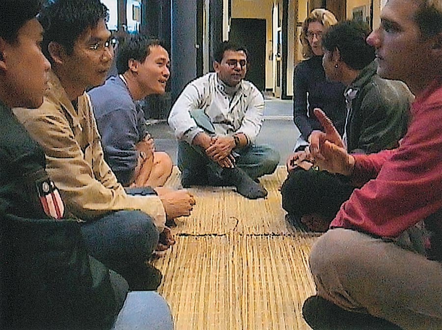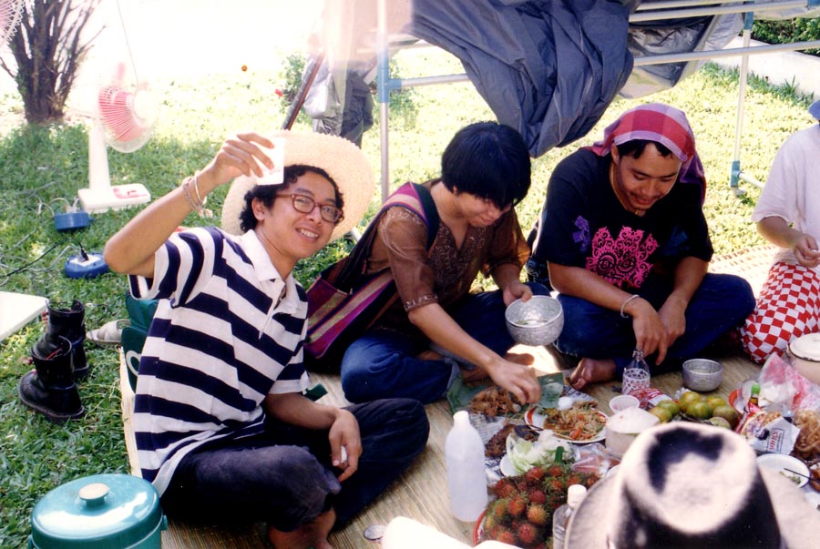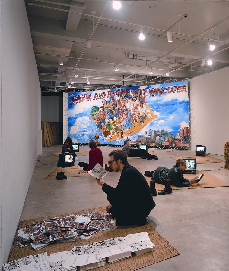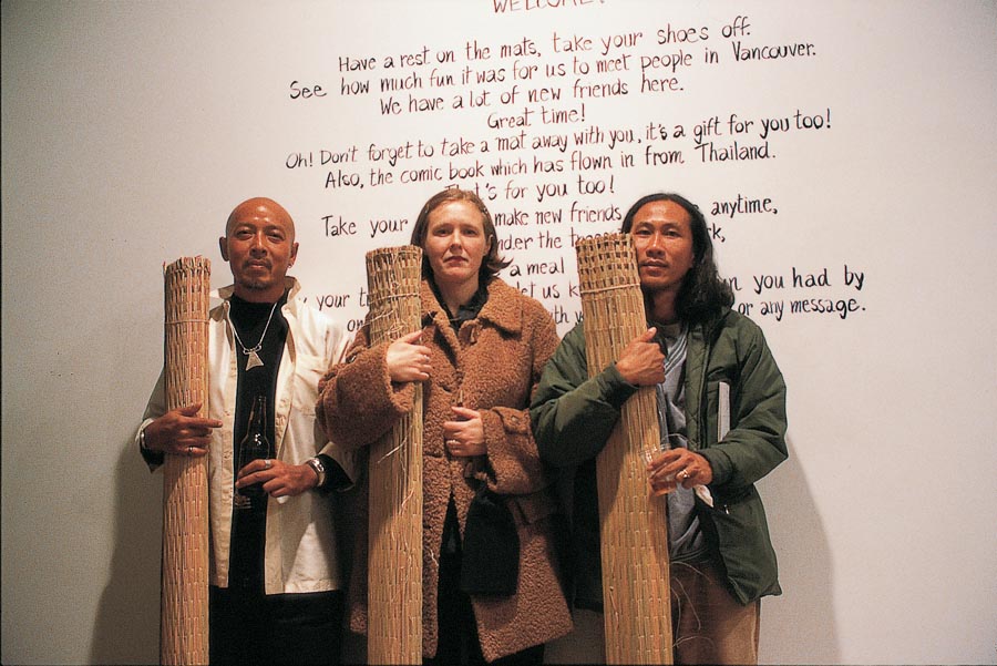 A solo show in which Navin Rawanchaikul collaborated with three of his high school friends as they travelled to Vancouver with a reed grass mat in hand. The mat is a welcome space in Thai and Asian culture that is rolled out when friends visit, a device for communication it is also about being in close proximity to the earth. The project explored how this ready-made vernacular object could be given new context. A multicultural city with a flood of Asian migrants, Navin and the gang documented themselves touring Vancouver getting to know the mix of inhabitants with the resulting footage shown across several monitors placed on the floor mats in the gallery. Aside from the videos, visitors called also lounge on the mats and read Navin’s first ever comic book, while behind was a large painted billboard depicting the gang on a magic mat-carpet flying above Vancouver. The exhibition also gave out free reed mats to visitors along with postcards inviting people to record their thoughts on what they did with the grass mats and send the cards back to the gang in Thailand.