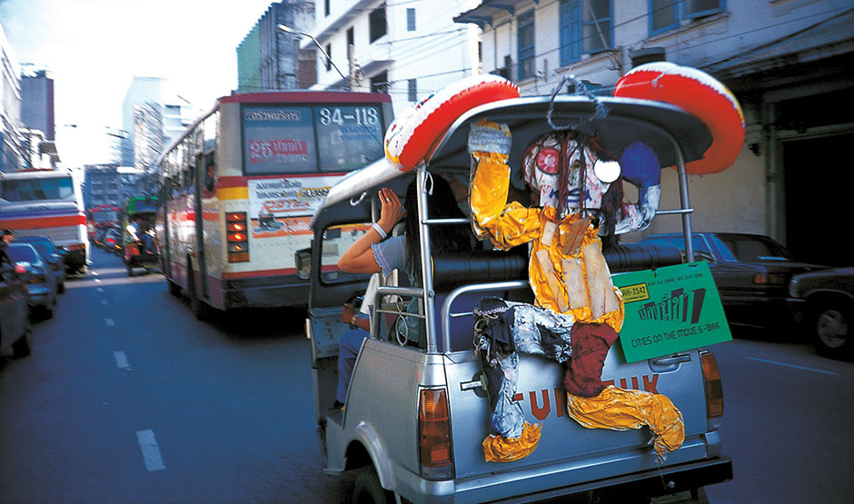After two years on the road, Cities on the Move came to Bangkok but both the broken tuk-tuks were left in Europe. The two artists managed to negotiate with the local tuk-tuk manufacturer, securing 20 tuk-tuks to be used as free shuttles between the different exhibition venues. They also functioned as a mobile gallery through collaborations with local artists and Tsuyoshi Ozawa’s milk box gallery, Nasubi Gallery. The 20 tuk-tuks were made in different shapes and functions. Recognised as a sort of national icon, the tuk-tuk can be used for various functions such as transporting animals, garbage, milk, gas, water, drinks, etc. With a little fantasy, a fictional tuk-tuk transported Kosit and his pals to Bangkok 543 years in the future, where buildings have legs and taxis fly through the sky. Unexpectedly, Kosit meets his beloved Thai girlfriend who has been kidnapped by gangsters, and our hero driver proves his real love by saving the girl whom he finally marries. A poster was produced and plastered across Bangkok’s public spaces and a comic narrating the whole adventure was also designed, but unfortunately it was never published.
