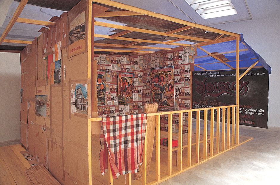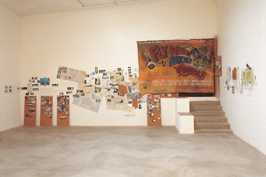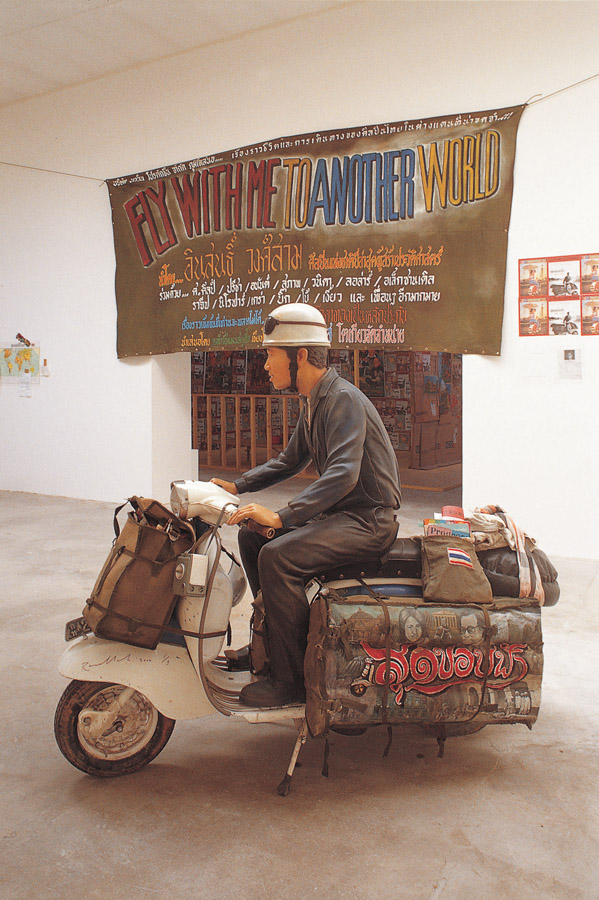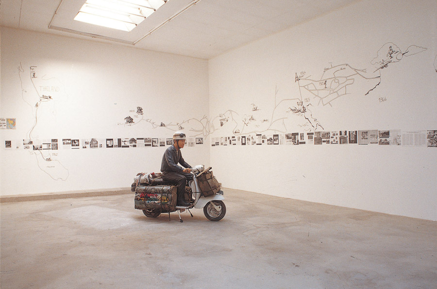 Almost identical to the award winning presentation at Art Basel but with a bigger space allocation, the project invited two young Thai artists from a Chiang Mai scooter gang to attend. Navin purchased a Lambretta scooter in Italy with the intention of his two protégés to ride the bike from Italy to France following Inson Wongsam’s original route but living new adventures. In actuality they weren’t allowed to travel by bike across the international border (because the scooter had no license), so instead they reluctantly travelled by bus and train. Nevertheless they presented an illustrated diary, along with several videos, photographs, and other associated objects found along their journey.