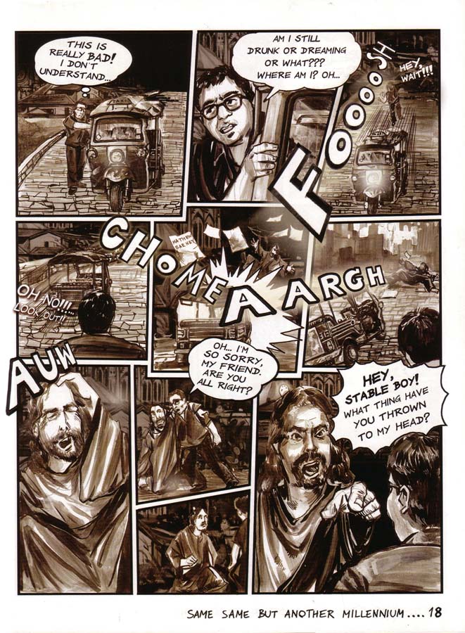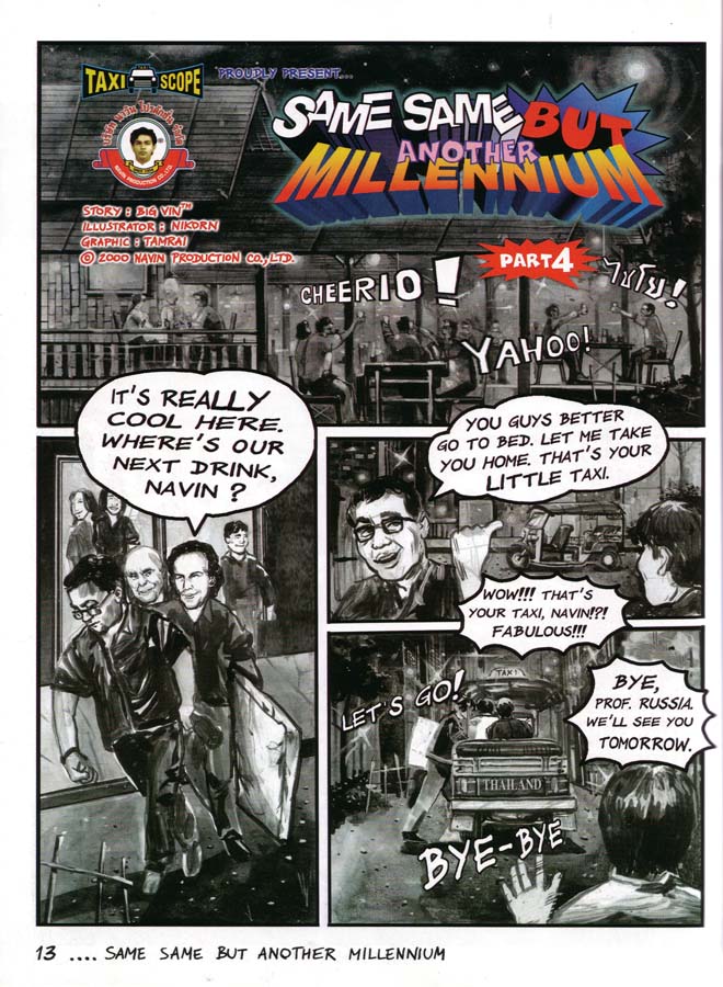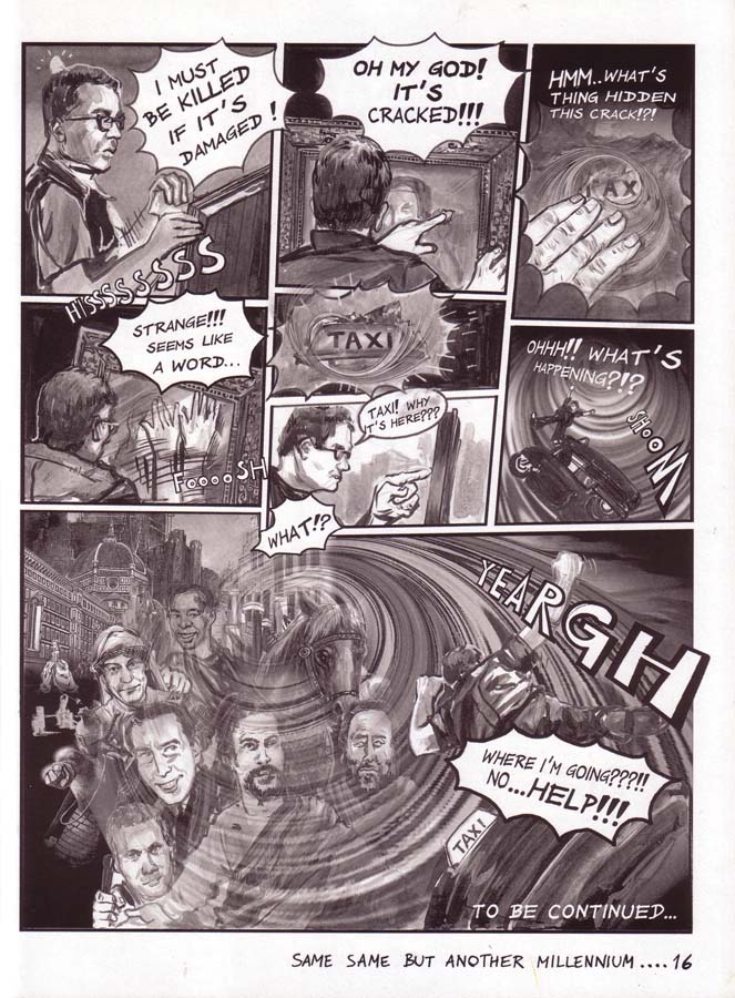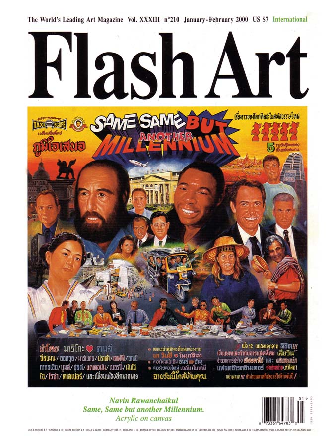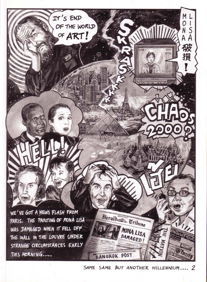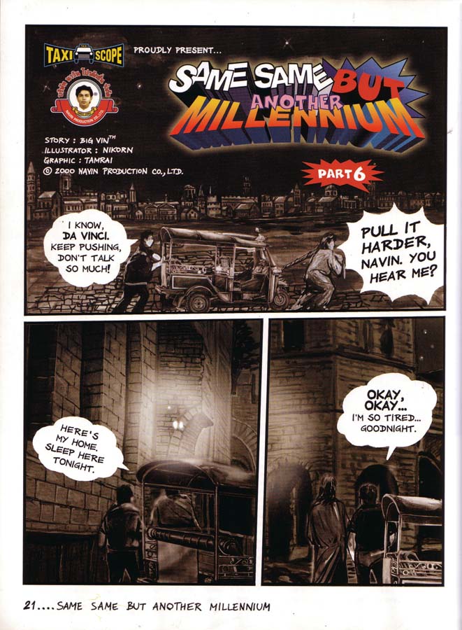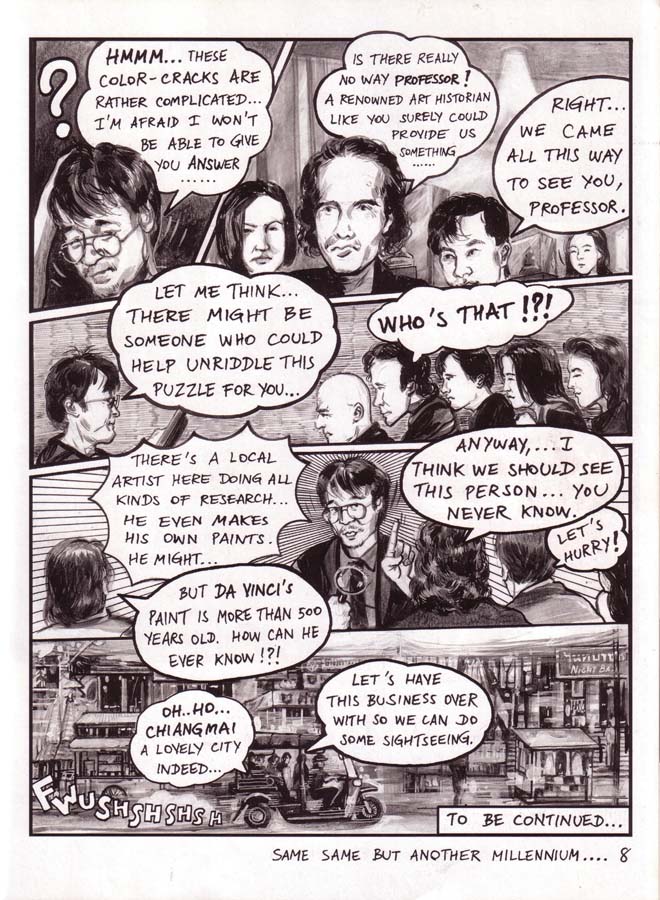 This specially drafted comic series for Flash Art International magazine ran over four-pages in seven consecutive issues. Before Dan Brown, Navin Rawanchaikul lays claim to his Na Vinci Code, the story of which starts at the Louvre on millennium night, with the surface of Leonardo’s Mona Lisa cracking up. Behind the cracks Flash Art publisher Giacarlo Politi and his family find Asian paint pigment with art experts Hans-Ulrich Obrist and Hou Hanru asked to take the painting to show Navin in Thailand. Navin shows it to his art professor friend, meanwhile the painting cracks further to reveal a taxi sign hiding in the landscaped background. Navin, an artist-cum-tuk-tuk driver, travels back in time with the visitng art experts to 15th century Florence, to meet the young Leonardo. Struggling among his peers and competing against other artists, Leonardo wants to paint Mona Lisa but she isn’t interested, so Navin and his gang have to persuade her. Jeff Koons, Damien Hirst and other art celebrities also appears in Florence to criticise Leonardo’s work. Romance blossoms between Navin and the Mona Lisa and she finally agrees to be painted with Navin supplying paints to Leonardo that he has kept in the back of his tuk-tuk. Navin confesses his love for Mona Lisa, but her family doesn’t understand Navin or his tuk-tuk contraption, yet the vehicle does help inspire Leonardo to draw his flying machines. A rejected Navin leaves his tuk-tuk in Florence and is transported back to the present, but lovesick Mona Lisa asks Leonardo to paint the tuk-tuk into the background of her portrait as a memory to her lost love. Later Mona Lisa’s family order another artist to paint over the background tuk-tuk, which is why no-one has ever seen it until now.