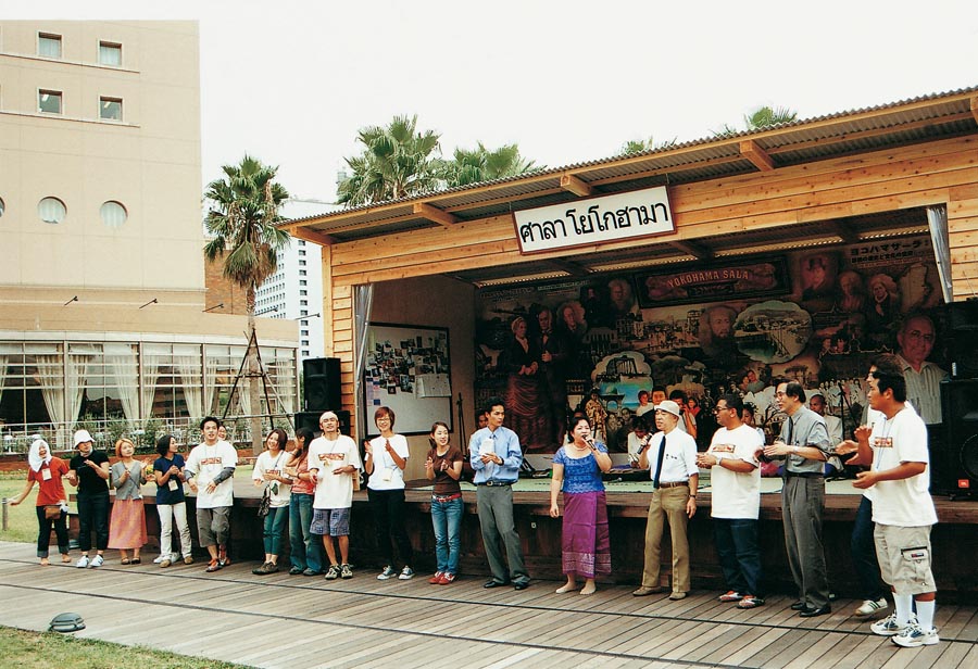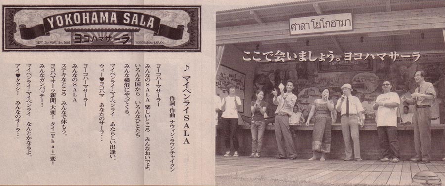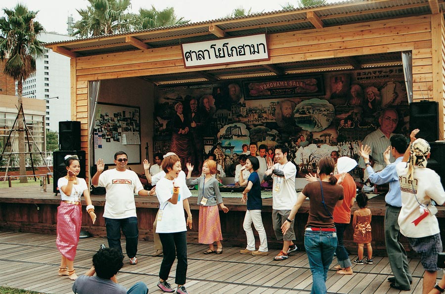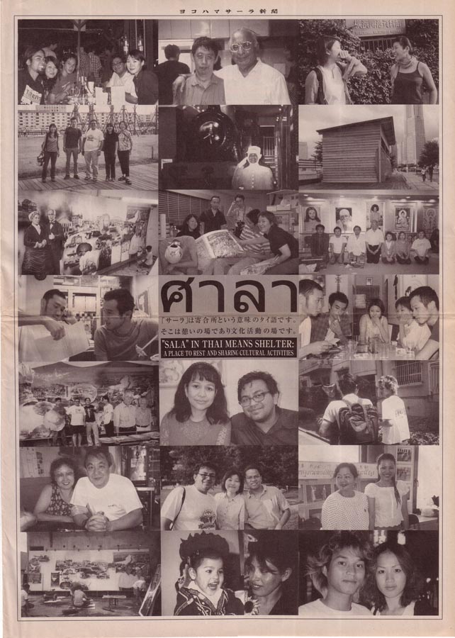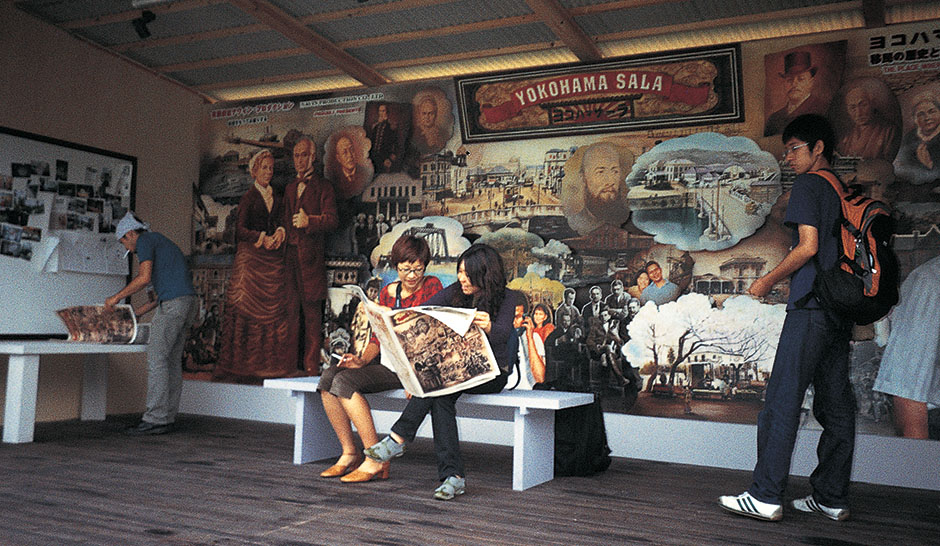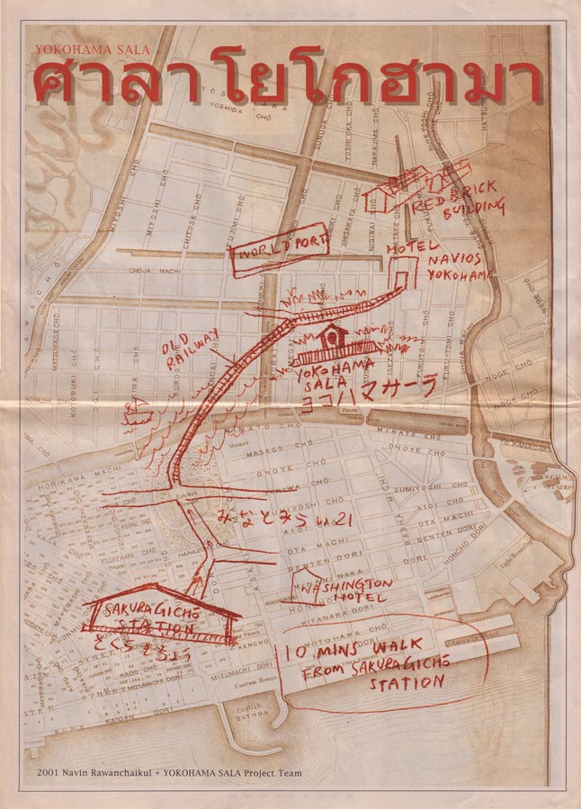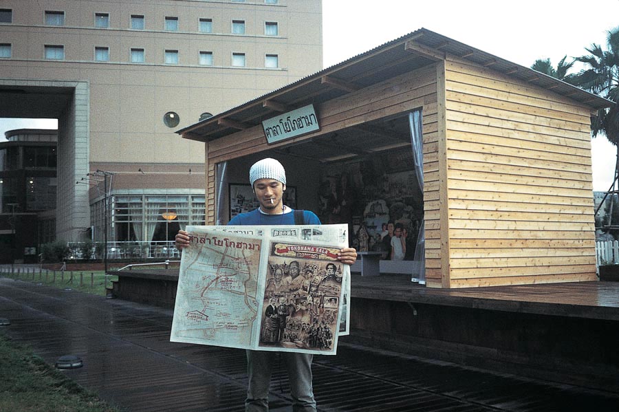 With Yokohama historically Japan’s first international port, the area has a strong foreign influence, which Navin Rawanchaikul responded to from the position of a foreigner living in Japan. A Thai sala, or open-sided pavilion, was imported to Yokohama to serve as an imaginative train station, the Yokohama Sala. A platform along an old disused railway track in a downtown public park was open 24-hours a day during the three-month long 2001, 1st Yokohama Triennale. Inside the sala was a cinema style billboard painting pertaining to the history of foreign influence in Yokohama, beginning with the 19th century American naval Commodore Perry. Navin and his band of collaborators, which ranged from art professionals to students and NGOs, interviewed foreigners living there today and published the stories alongside local history, sport, music, food, and comics, in a series of five custom-made free Yokohama Sala newspaper. Intended as a space for creativity but also a place to rest, the Yokohama Sala hosted special events including traditional music from a Yokohama-based Cambodian band and a samba drum performance by a local youth club.