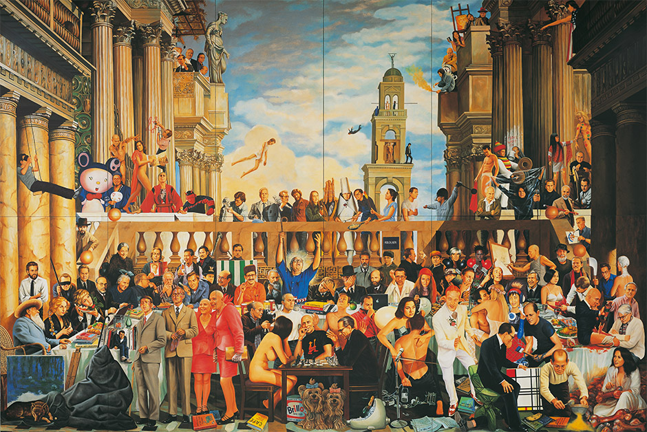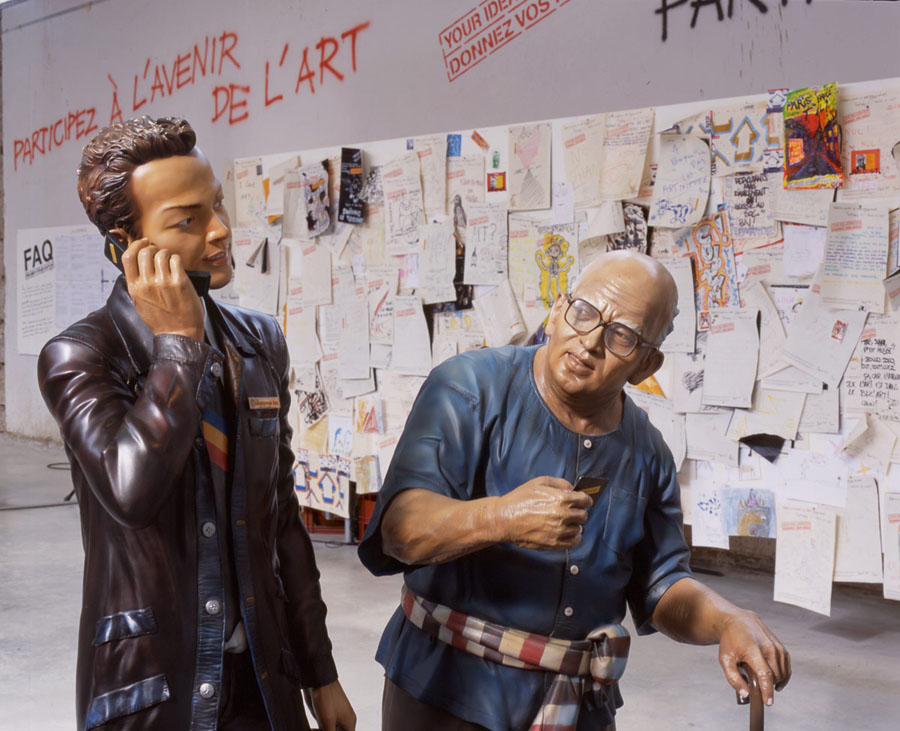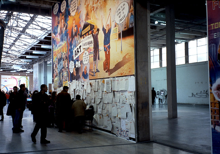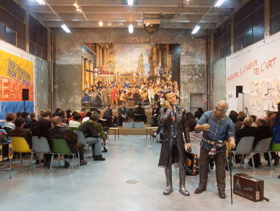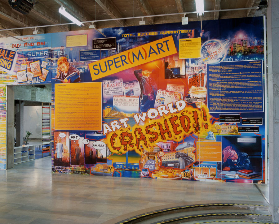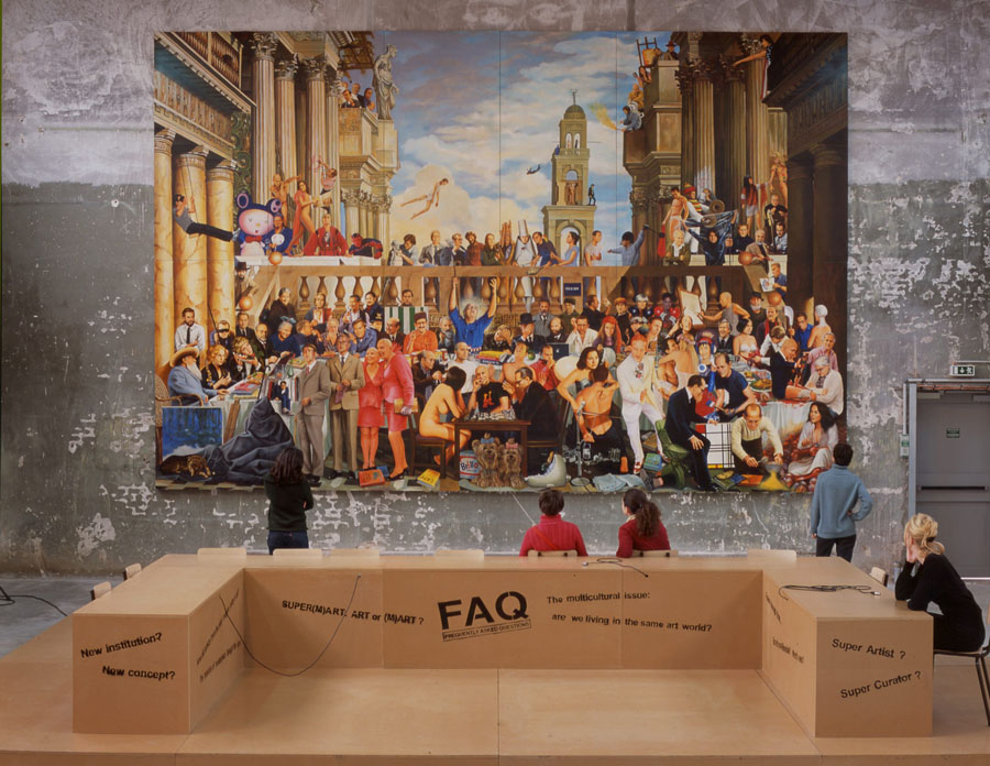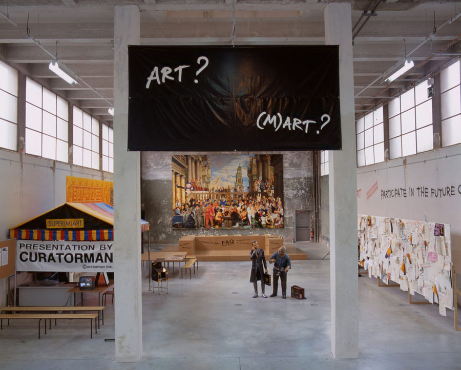 For the debut show at the Palais de Tokyo and the premiere of SUPER(M)ART, Old Navin, a poor retired artist has travelled to Paris in 2052 after winning the lottery, where he plans to visit the famous art establishments only to find them all closed down. Instead he meets Curatorman, a slick and youthful entrepreneur dedicated to the commercialisation of art, and an angry debate over art ensues. At the exhibition site, the installation included a life-size figure of poor Old Navin and Curatorman carrying a briefcase and mobile phone. Behind the Perspex figures is a huge remodelled painting of Paolo Veronese’s The Wedding Feast at Cana (1563), with the original wedding guests supplanted by more than 150 influential figures from the modern art world’s cognoscenti, from Van Gogh and Pollock to Duchamp, Koons, and beyond. To the side of the installation was a notice board for ‘idea-donations’, a forum for visitors to contribute their notions on art’s present and future, and a large wall with a comic mural at the entrance. A table mirroring that in the centre of the Veronese classic was placed in front of the painting, around which discussions and lecture series on related topics took place with academics and curators. A Curatorman’s campaign tent was also erected on one side, in which a Japanese scholar Sen Uesaki played the role of Curatorman inviting people to discuss ideas on the future of art. Fifty thousand copies of a free tabloid paper the Point d’ Ironie was published for the event, which included a Navin Production comic and a blank tear-off page requesting the donation of ideas upon the future of art by posing the open-ended question art or (m)art?