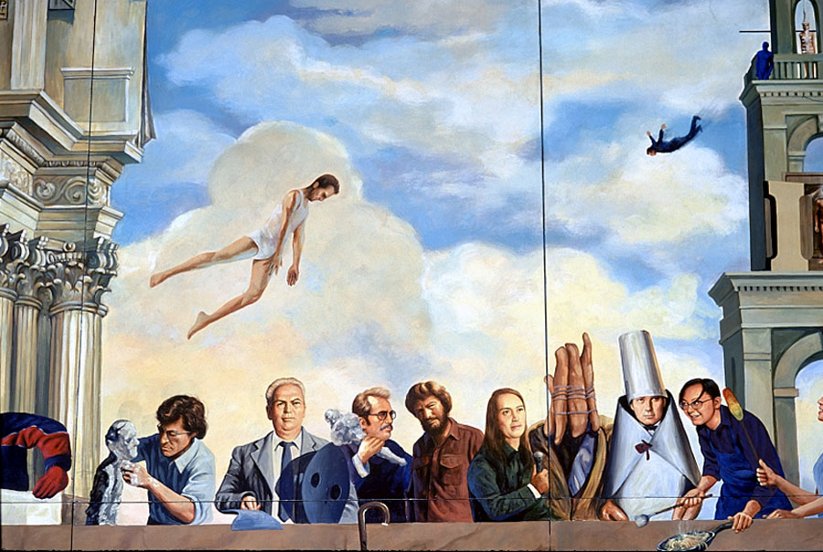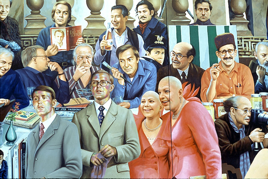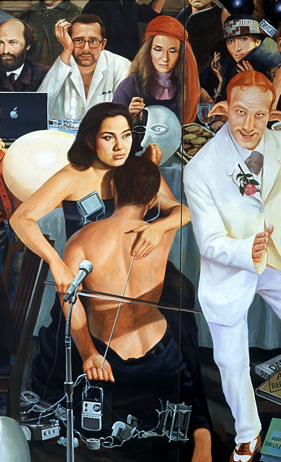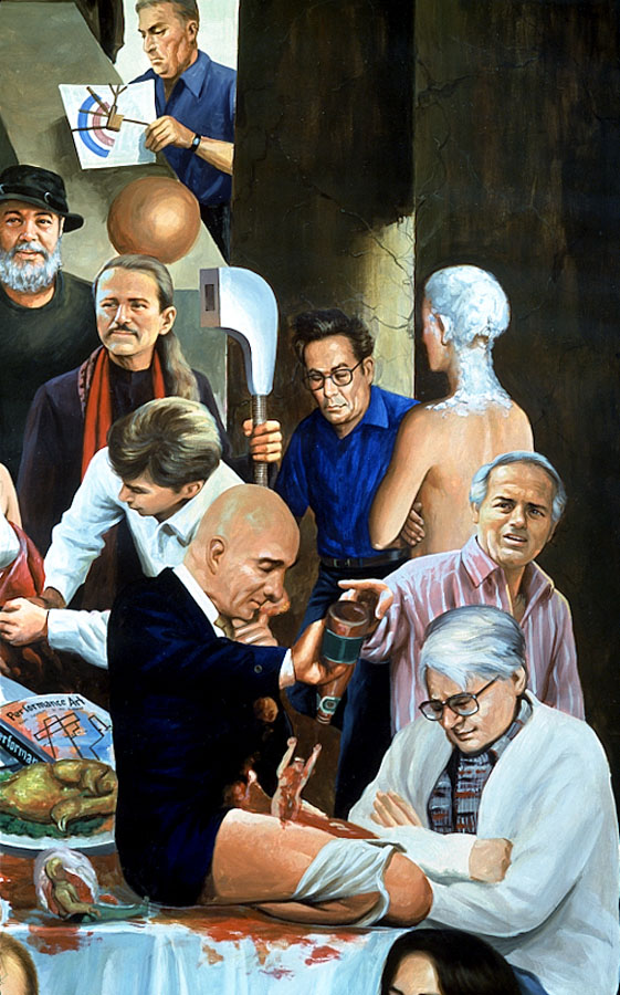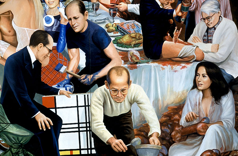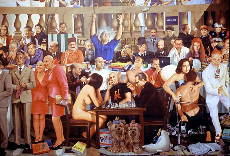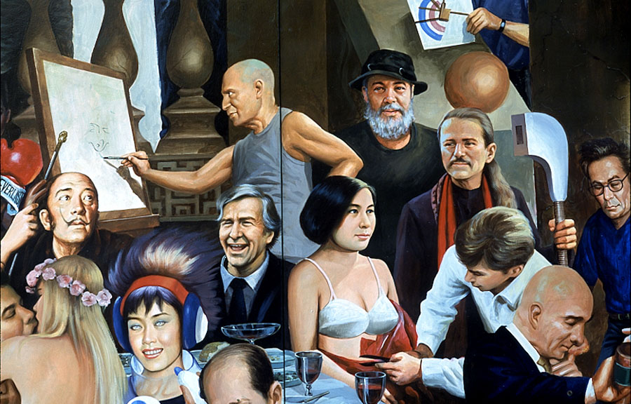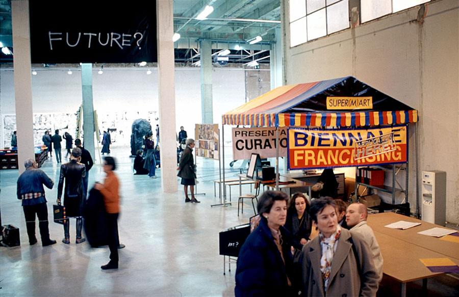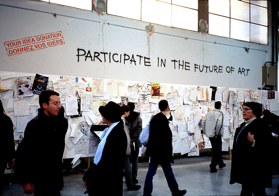 For the debut show at the Palais de Tokyo and the premiere of SUPER(M)ART, Old Navin, a poor retired artist has travelled to Paris in 2052 after winning the lottery, where he plans to visit the famous art establishments only to find them all closed down. Instead he meets Curatorman, a slick and youthful entrepreneur dedicated to the commercialisation of art, and an angry debate over art ensues. At the exhibition site, the installation included a life-size figure of poor Old Navin and Curatorman carrying a briefcase and mobile phone. Behind the Perspex figures is a huge remodelled painting of Paolo Veronese’s The Wedding Feast at Cana (1563), with the original wedding guests supplanted by more than 150 influential figures from the modern art world’s cognoscenti, from Van Gogh and Pollock to Duchamp, Koons, and beyond. To the side of the installation was a notice board for ‘idea-donations’, a forum for visitors to contribute their notions on art’s present and future, and a large wall with a comic mural at the entrance. A table mirroring that in the centre of the Veronese classic was placed in front of the painting, around which discussions and lecture series on related topics took place with academics and curators. A Curatorman’s campaign tent was also erected on one side, in which a Japanese scholar Sen Uesaki played the role of Curatorman inviting people to discuss ideas on the future of art. Fifty thousand copies of a free tabloid paper the Point d’ Ironie was published for the event, which included a Navin Production comic and a blank tear-off page requesting the donation of ideas upon the future of art by posing the open-ended question art or (m)art?