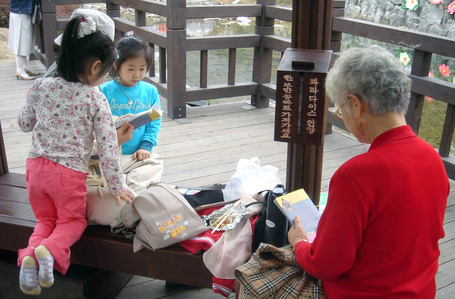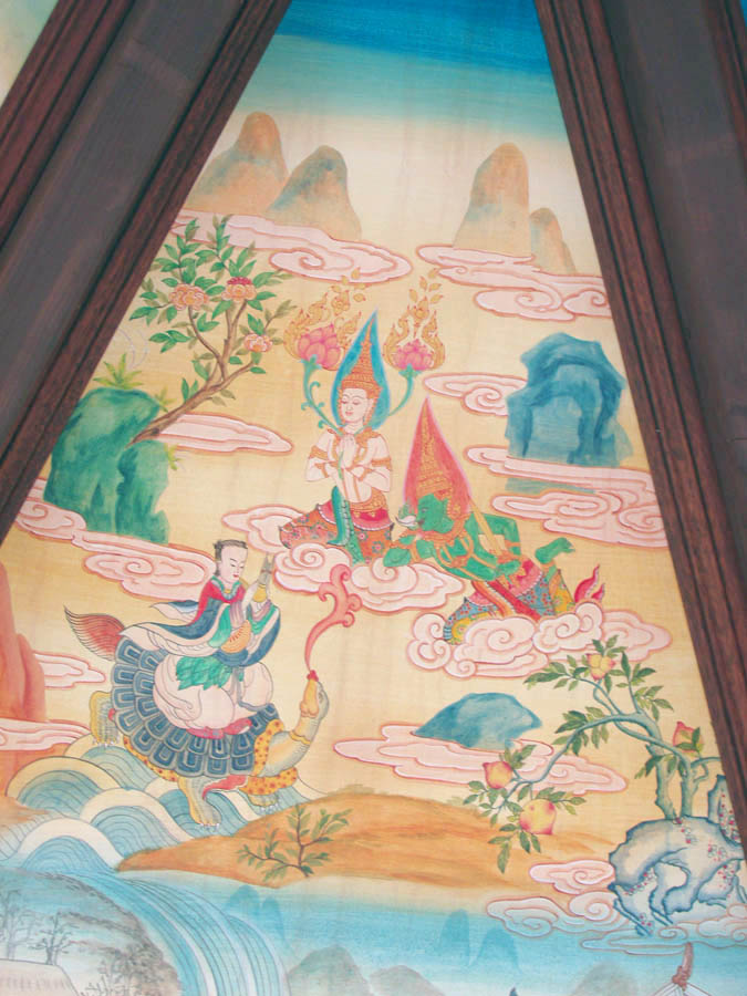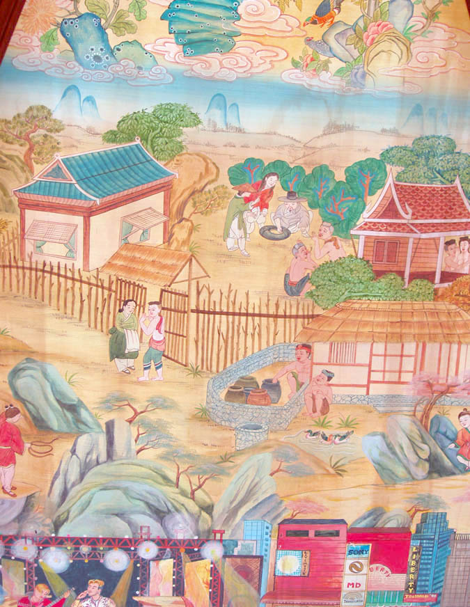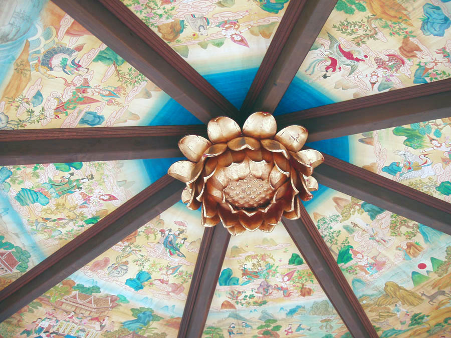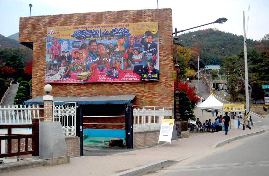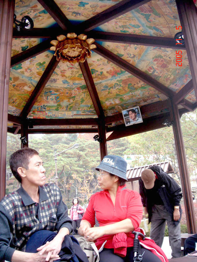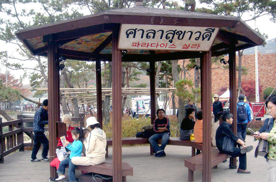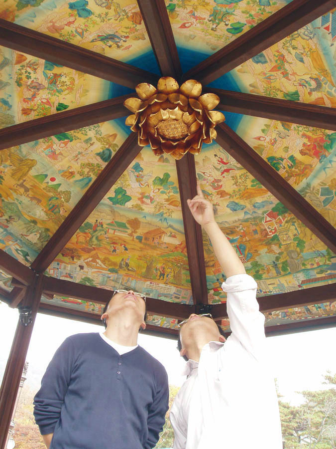 Meaning paradise or utopia in Korean, Anyang was the site for a public art project in which Navin Production decorated a Korean style gazebo with a traditional mural. Similar open-sided pavilions, or sala, are a focal point of most Thai rural communities, with the simple wood frame structures serving as an open platform to gather and communicate. Melding traditional Thai and Korean painting styles, the permanent Paradise Sala had a lotus flower in the centre of the ceiling with panels circumventing. There was also a permanent billboard painting displayed on a nearby wall that revealed scenes from the accompanying comic book, Paradise in Anyang, an imaginative tale of Thai scholar Pandit Chanrochanakit and how he came to marry his true love, the Korean painter Oh Hwan Hee. Distorting reality from fantasy, an ‘International Public Art Treasure’ sign was erected beside the Paradise Sala claiming the mural as a tributary memorial to their love story, playfully misleading the public as to the truth. Containing lots of cultural blurring, there was also a small video screen within the Paradise Sala that relayed interviews conducted in collaboration with Seoul-based emerging video artist Raymond Hahn, asking the local populace to define paradise.