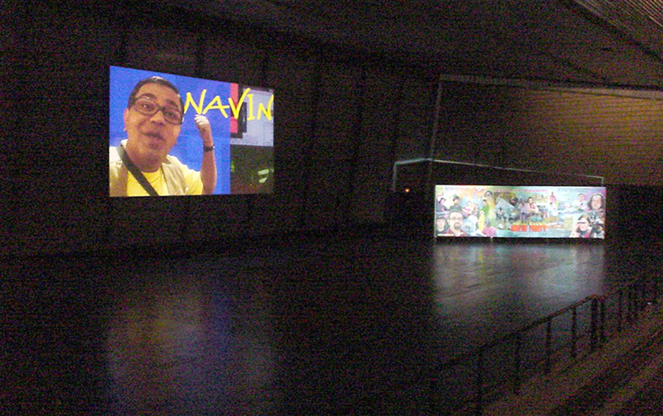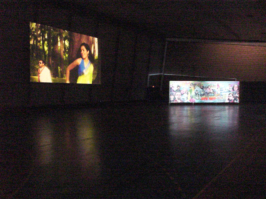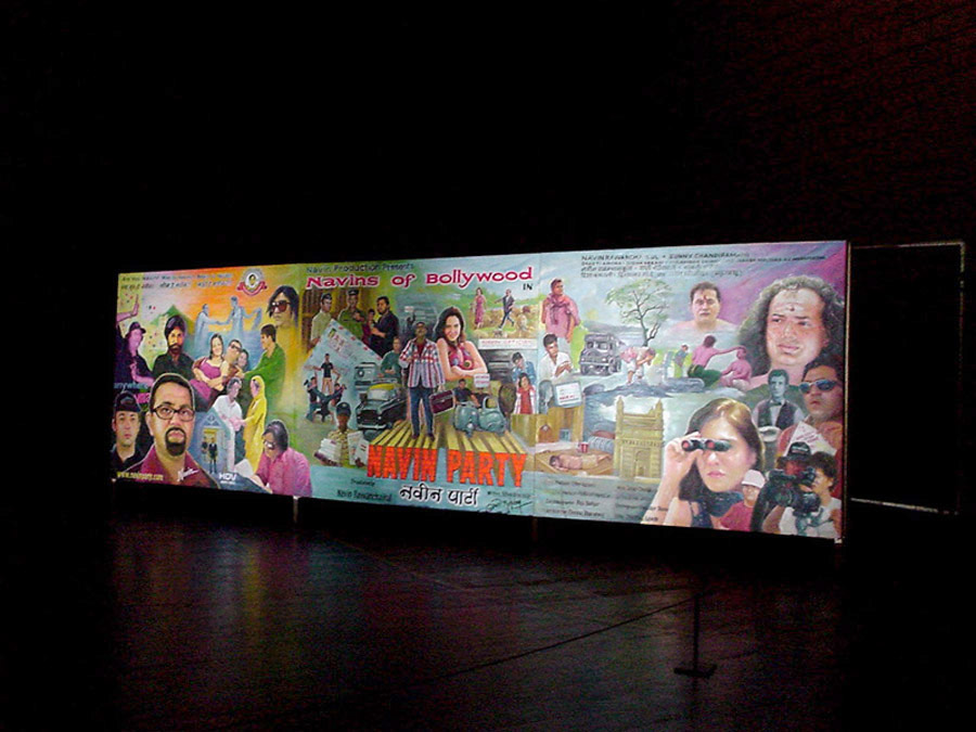 For Paris’ annual dusk-to-dawn art festival Nuit Blanche, Navins of Bollywood was shown on a big screen in the public gymnasium of the Carpentier Sports Complex. Hung on the adjacent wall to compliment the film was the same movie billboard painting created in Mumbai during the film’s production, enabling visitors an opportunity to view the painting physically and virtually simultaneously, relaying static visuals with moving imagery to convey its diasporal theme.