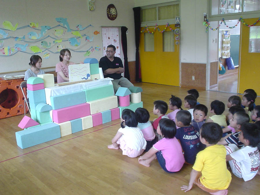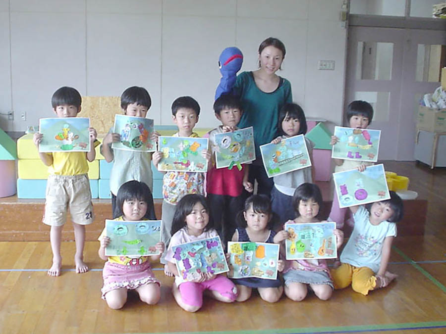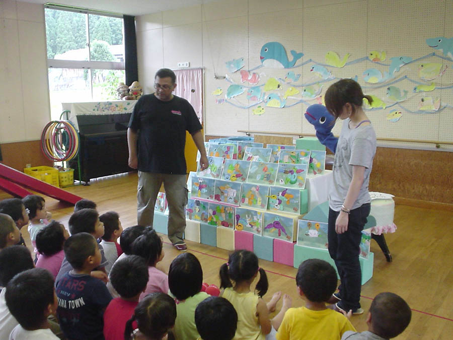 Based in surrounds of Niigata Prefecture in Japan, Echigo-Tsumari Art Triennale is a large-scale public art exhibition with community-based creative programs addressing environmental and agricultural issues. Supported by the Triennale’s volunteer group, Kohebi-tai or ‘Little Snake Squad’, Navin Production teamed up with three Tokyo-based young artists (Mayumi Kogoma, Fuyuki Sato and Hirotaka Tobimatsu) to produce a children’s book, Tale of a Little Snake. In the story Little Snake leaves his picturesque mountain village for the bright lights of the big city, only to find out his village is being destroyed by piles of garbage from tourism. Little Snake and his animal pals clean up the filth and recycle the waste into a beautiful sculpture park. As a part of the project, the team set up workshops in several kindergartens, where they read the story and inspired children to make art works and musical instruments on related themes.