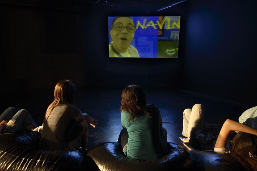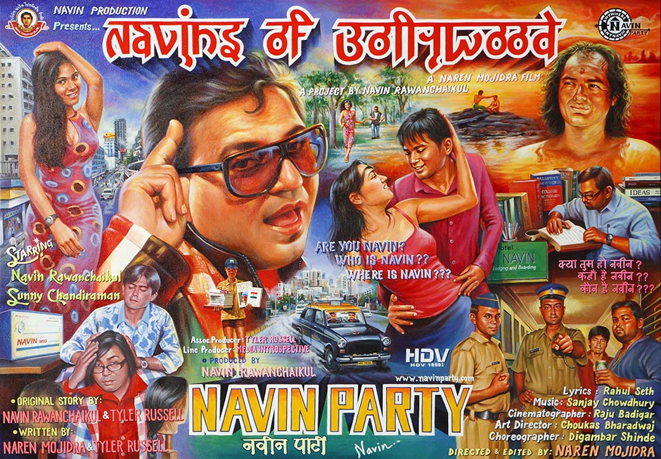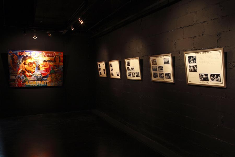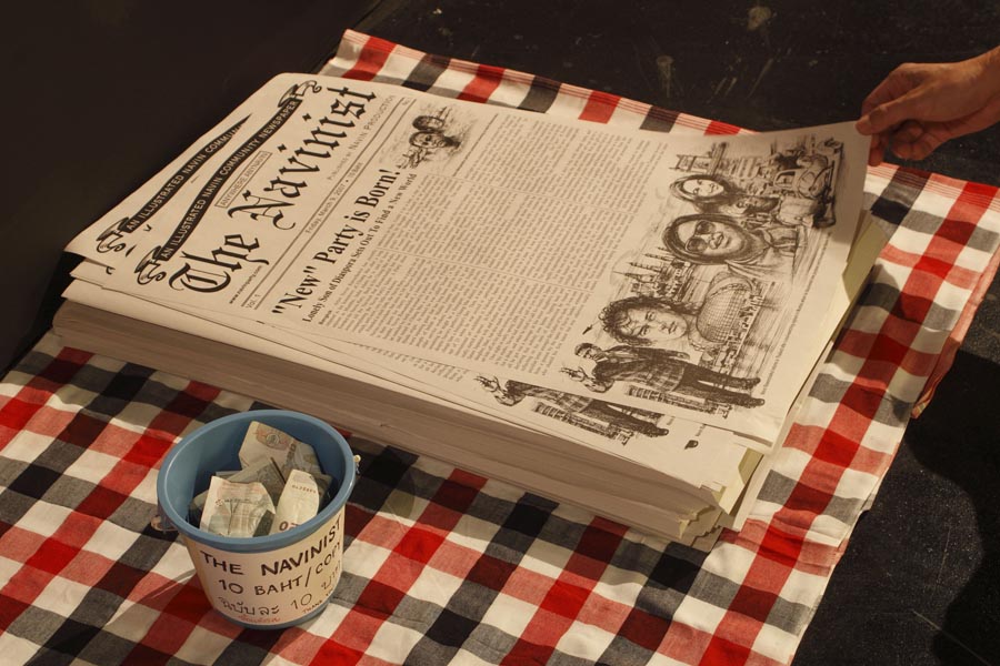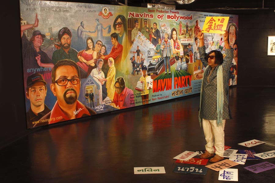 Tang Contemporary Art’s darkened interior functioned as a pseudo movie theatre with a small partitioned viewing room set up with casual floor cushions for viewing Navins of Bollywood. The rest of the gallery supported the screening room with 14-frames from the Navins of Bollywood Diary combining still photographs and the artist’s handwritten diarist text notes referring to the film plot, as well as a series of gelatine silver prints and Chinese charcoal drawings depicting a portrait of the artist and several characters from the film. There was also the large movie billboard dominating one side, while at the entrance way was a life-size Pesrpex model of Navin Rawanchaikul attired in his film costume and holding a “Navin” placard in Chinese, surrounded by multiple language signs scattered around on the floor. The gallery office was transformed into the Navin Party headquarters with photos, notes, and other materials pinned up on the walls as the search for global Navins continues. The first edition of The Navinist newspaper was published for the exhibition, providing the template for the illustrated Navin Community newspaper which will be periodically published in English as well as the local languages of wherever the Navin Party project travels to.