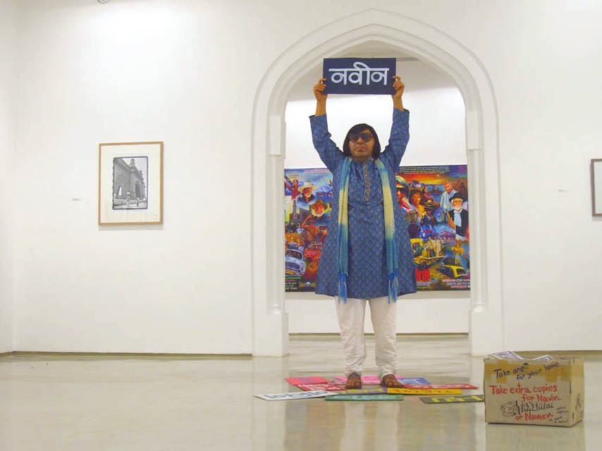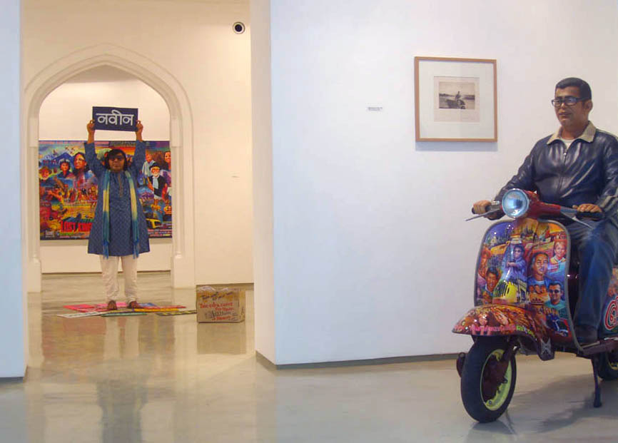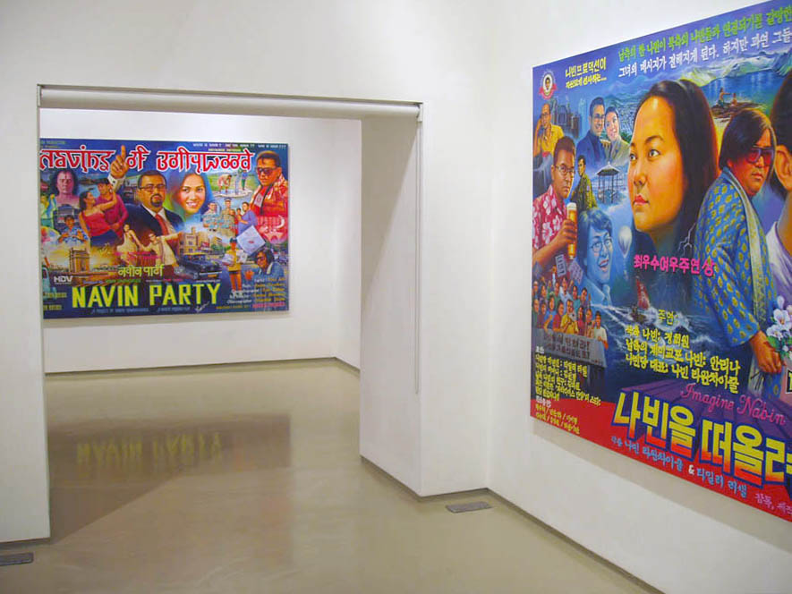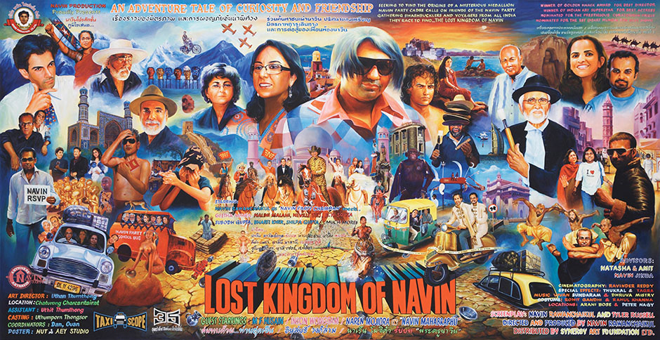 For Navin Rawanchaikul’s first ever exhibition in India, Navinland Cinema featured selected works by Navin Production that focused on the Navin Party project, an ongoing series that has developed collaboratively between Navin and Canadian Tyler Russell. The first major Navin Party project was Navins of Bollywood, a Bollywood-style short musical film directed by Mumbai-based Director Naren Mojidra. First shown as part of the 2006 IMF and World Bank Board of Governors Meeting cultural programme and since been part of exhibitions in several countries, this was the first time the film was brought back to India. The presentation also included Quotations from Comrade Navin bust and print series as well as coming soon Imagine Nabin billboard painting. The centrepiece of the exhibition, Lost Kingdom of Navin is a movie painting featuring people and works from Indian modern and contemporary art. Not just artists, but also critics, collectors, gallerists, advertisers and auctioneers, are composed as movie stars who joined the Navin Party cadre in the search for the “Lost Kingdom of Navin”, which is thought to lie somewhere to the boarder of India and China.