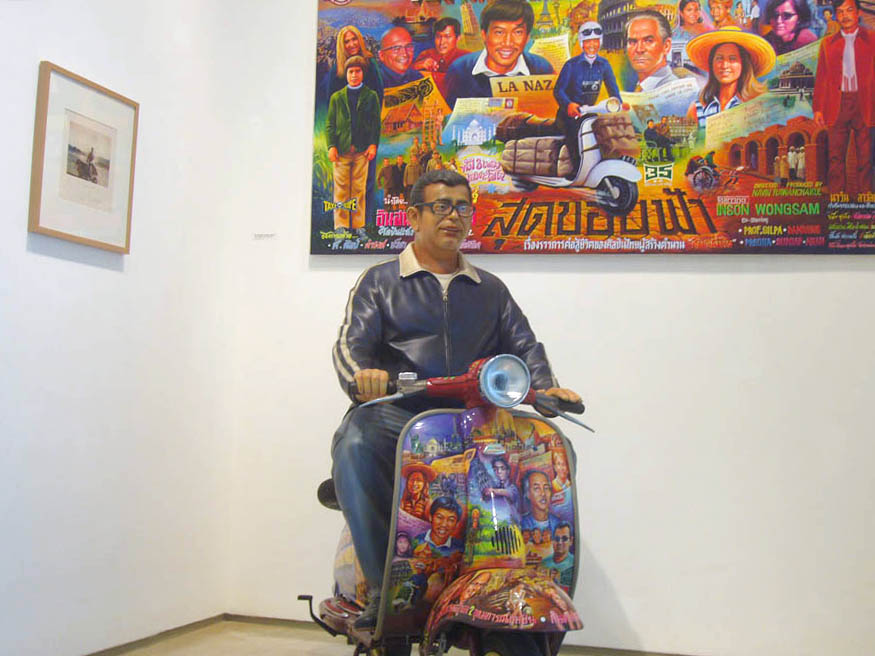 Navinland Cinema also featured Inson Wongsam, Navin’s mentor and a National Artist of Thailand, who has continually played an important role in Navin Production’s episodes since the 1999 Fly with Me to Another World. In this new chapter, Inson gave Navin an old medallion, which was believed to belong to the lost tribe called Navin. As an extension of Navins of Bollywood, a 48-page comic Who is Navin? was created. The comic melded Navin’s biography and his Bollywood adventure into a new mysterious search. The multiplex exhibition also launched a life-size fiberglass sculpture of Navin riding on a painted scooter. Parallel to the previous version of Inson Wongsam and his famous Lambretta scooter that was released in 2000, this new version of Navin Production’s scooter reaffirmed that the legend must be continue.